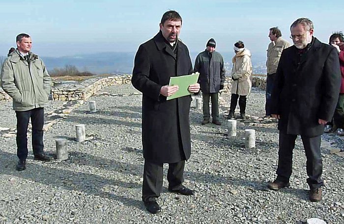 Beim blauem Himmel, aber klirrender Kälte (dort oben zieht es immer, zum Glück hatten Vereinsmitglieder an heiße Getränke gedacht) hatten sich neben Landrat Peter Hengstermann (re.) und Bürgermeister Joachim Kreyer weitere Gäste vom Jechaburger Heimat und Geschichtsverein eingefunden, so der Vereinsvorsitzende, Uwe Lüttkopf (li.).