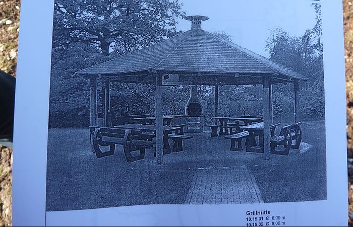 Bauamtsleiter Manfred Kucksch ließ kn mal einen Blick auf die Zeichnungen werfen. Der Pavillon wird die bisher stehenden Sitzgruppen ablesen, die nicht mehr den Erfordernissen entsprechen. Ältere Leser werden sich vielleicht noch daran erinnern, wo früher mal eine Gaststätte stand. Auf diesen Grundmauern soll dann der Pavillon errichtet werden.