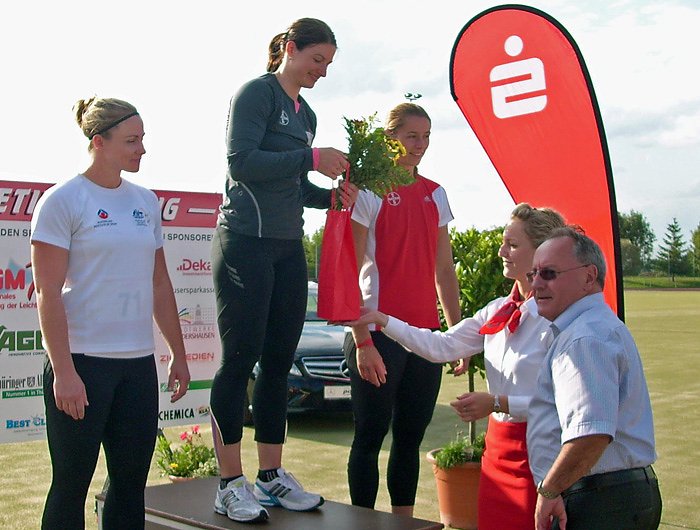 Ulrich Heilmann bei einer der Siegehrungen beim Sparkassen-Meeting 2010 mit der Siegerin, Europameisterin Linda Stahl.