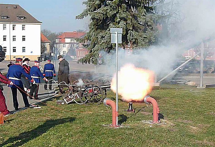 Bevor Stabsfeldwebel Harald Liebau verabschiedet wurde, bekam er noch eine besondere Auszeichnung vom Kommandeur überreicht. Oberstleutnant Glaab verlieh ihm die Kommandeursmünze des Raketenartilleriebataillon 132 mit der fortlaufende Nummer Acht. Schon daran ist zu erkennen, dass sich SFw. Liebau besondere Verdienste bei der Truppe erworben hatte. Er hatte maßgeblich an der Partnerschaft mit Schwarzpulverkanonieren aus Allstedt gearbeitet. Der Vorsitzende des Verbandes der Schwarzpulverkanonieren hatte deshalb gleich einige Kanoniere und Kanonen (Kaliber 63 mm) für das Salutschießen mitgebracht.