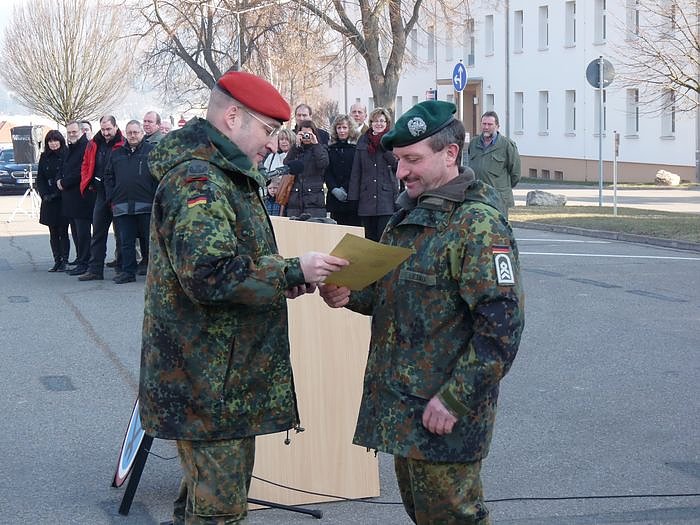 Zuerst verabschiedete Oberstleutnant Klaus Glaab den Oberstabsfeldwebel Frank Süss. OstFw. Süss ist seit dem 03.10.1977 Soldat und begann seine Ausbildung in Homberg / Efze. Im Jahre 1992 wurde er nach Gotha versetzt und qualifizierte sich als Schirrmeister, wo er seine Profession als "Schrauber" unter Beweis stellen durfte. Bis 2003 wurde er dann als Zugführer eingesetzt, bevor er dann über die Zwischenstation Bad Neuenahr im Jahre 2007 nach Sondershausen kam. Später dankte sich OstFw. Süss in bewegenden Worten mit einem Blumenstrauß bei seiner Frau, die im Dienst mit der Erziehung der Kinder den Rücken freigehalten hatte. "Bundeswehr ist mein Leben" sagte er und betonte, Bundeswehr war für ihn immer ein Beruf und kein Job.