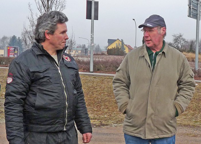 Es waren trotz der tiefen Temperaturen um minus drei Grad Celsius eine ganze Reihe Gartenfreunde dem Aufruf gefolgt, sich an einer Übung des Baumschnitts teilzunehmen. Der Vorsitzende des Kleingartenverbandes Kyffhäuserkreis Wolfgang Dittrich (re.) hatte dazu seinen Fachberater Baumschnitt, Dirk Belz, mitgebracht.