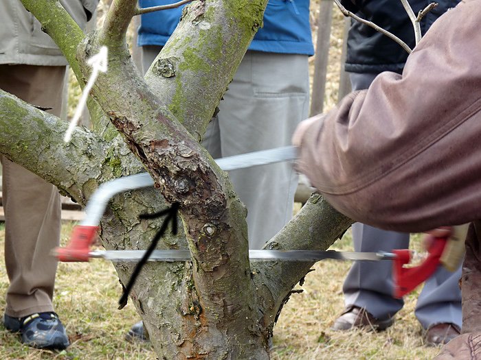 An einem Baum, der vor längerer Zeit mal beschnitten worden war, sollte als Übungsobjekt dienen. Und das Gute dabei, der Experte machte es nicht gleich vor, sondern man sollte sich selbst erst mal Gedanken machen, wo man Baumschere oder gar gleich die Säge ansetzt. Jeder sollte ja auch deshalb Schere und Säge mitbringen.