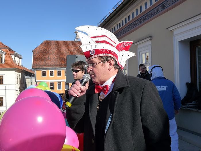 Alexander Aquillon moderierte auf dem Balkon des Rathauses von Sondershausen die ganze Rosenmontagsparty in bewährter Weise.
