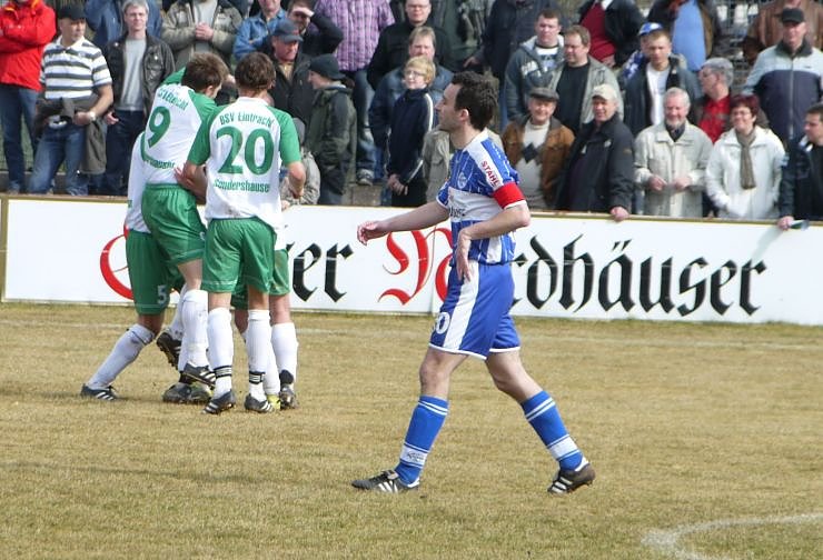 Drei Minuten später nimmt Klaus erneut Maß, die Höhe war die gleiche, nur die Seite eine andere. Im Gegenzug hatte Sebastian Caspar die Führung auf dem Latschen, seinen harmlosen Schuss konnte Greschke jedoch parieren. In der 37. Minute ist der Nordhäuser Tormann jedoch machtlos, als Ludwig erneut eine Unsicherheit in der Wacker nutzen konnte (0:1). Dem vorausgegangen war ein unnötiges Revanchefoul von Lars Pohl an einem Sondershäuser Spieler. Dann ist Halbzeit. Endlich, grottenschlechter hätte es nicht werden können.