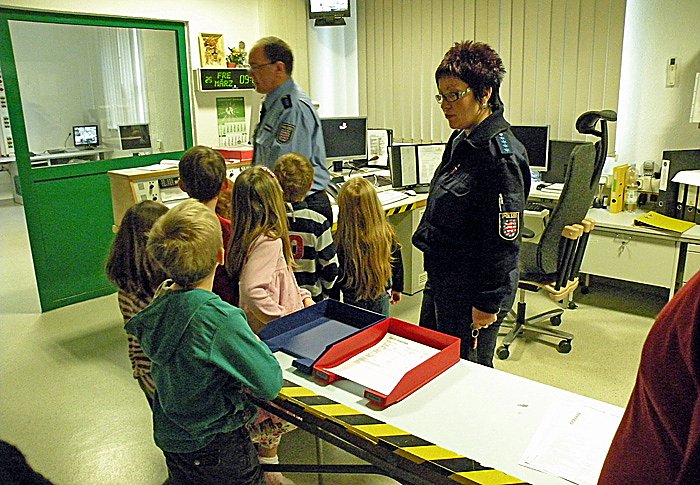 Dort angekommen wurden wir von Frau Montag herzlich begrüßt. Und dann ging es schon los! Als Erstes zeigte sie uns einen Raum, in dem alle wichtigen Daten von den Straftätern in einen Computer aufgenommen und gespeichert werden, z. B. Größe, Gewicht, Haarfarbe und die Fingerabdrücke. Auch wir durften das alles mal ausprobieren, und so konnte jeder, der wollte, seinen stark vergrößerten Fingerabdruck am Computerbildschirm bewundern.Danach ging es weiter zur Einsatzzentrale. Hier mussten wir sehr leise sein, damit der diensthabende Polizist die ankommenden Notrufe auch deutlich verstehen konnte.
