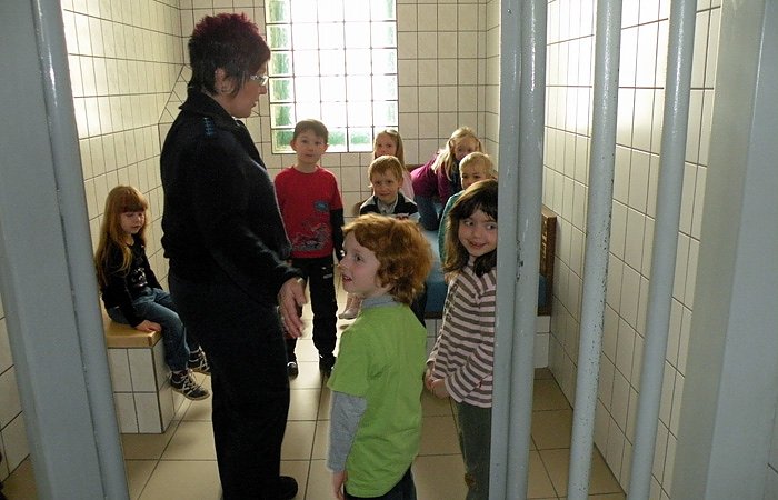 Unser Besuch wurde immer aufregender, denn jetzt kamen wir zu den Arrestzellen. Ein bisschen mulmig war uns ja schon, als uns Frau Montag aufforderte, einmal hineinzugehen. Geduldig beantwortete sie alle unsere Fragen und erklärte uns, wozu all die Dinge hier drin da sind. Sogar eine spannende Geschichte hat sie uns dazu erzählt.