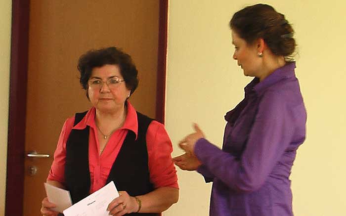 Die Leiterin des HOC, Cornelia Ketelsen (hier mit Moderatorin Josefine Fröbisch), konnte sich wieder über ein volles Haus freuen. Warum diese Modenschauen immer so gut ankommen? Es wird tragbare Mode vorgeführt, und das nicht von spindeldürren Models, sondern von Damen aus dem täglichen Leben, wie die heutigen Models Anne, Christa, Uschi oder Heidemarie.