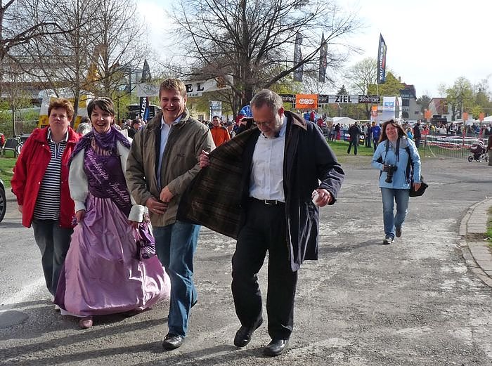 Das müssen auch die Prominenten gehört haben, denn Landtagsmitglied Gudrun Holbe, Fliederkönigin Isabell I. Bad Frankenhausens Bürgermeister Matthias Strejc und Landrat Peter Hengstermann verließen flugs den Kyffhäuserberglauf um auch ganz artig zu sein. Ob die vier artig genug waren, hat kn verpasst und nicht mitbekommen, ob und was sie bekommen haben. Aber der Landrat hat zumindest einen Apfel abbekommen. Die kurze Eröffnungsrede hielt der Bürgermeister, der aber als bald wieder Richtung Schlossplatz zum Berglauf musste.