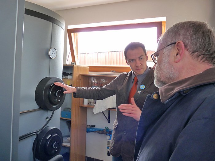 Und heute gab es noch mal so richtig Geld. Hier lässt sich Landrat Peter Hengstermann (CDU) vom Vereinsvorsitzenden Thomas Röber erklären, wie die neue Solaranlage funktioniert. Mit ihr, und mit dem Bezug von Öko-Strom verhindert allein der Verein, dass jährlich 5,5 Tonnen Kohlendioxid in die Atmosphäre gelangen.