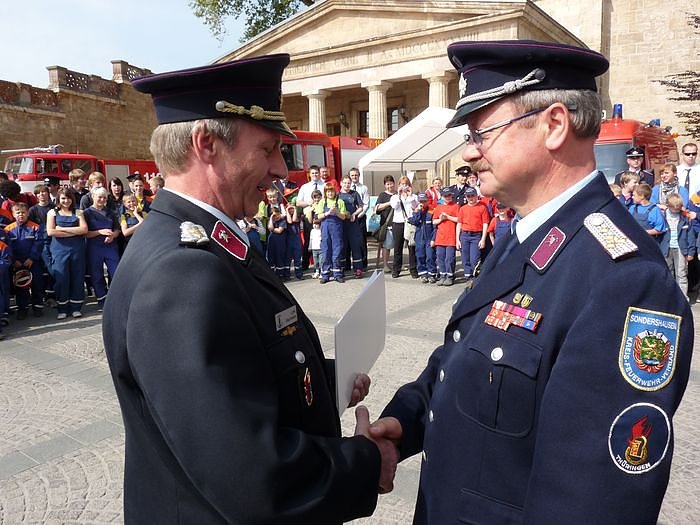 Natürlich ließen es sich Landrat Peter Hengstermann und Sondershausens Bürgermeister Joachim Kreyer (beide CDU) nicht nehmen, gegen 10:00 Uhr die Präsentation zu eröffnen, und den jungen und alten Feuerwehrleuten für ihre Einsatzbereitschaft zu danken. Kreisbrandinspektor Peter Ortlepp wies darauf, dass das nur die Jugendfeuerwehren aus dem Westteil des Kyffhäuserkreises seien. Im Ostteil gäbe es noch mal so eine Anzahl.