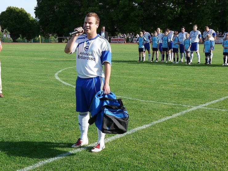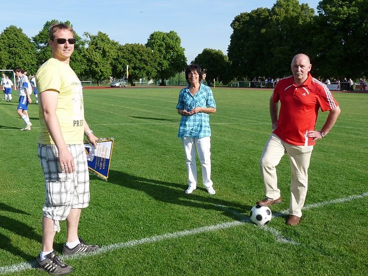 Den Ehrenanstoß nehmen dann der verletzte Blau-Weiß-Kapitän Dietmar Gödicke, die Vereinsvorsitzende des Oberturmvereins, Bärbel Köllen, und Dr. Räuber vor. Die Mannschaftsaufstellungen gibt es in der Bildergalerie.