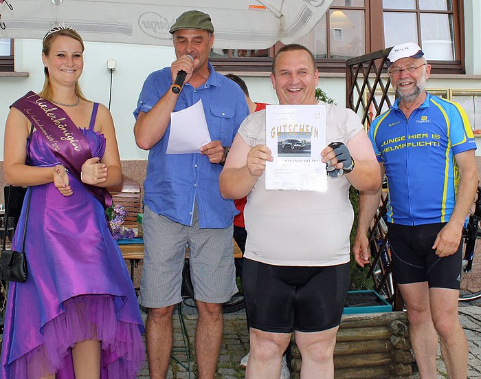 Glücklicher Gewinner des Hauptpreises, einem Wochenende mit einem Opel Insignia, wurde der Kalbsriether Roland Maltritz. Die Fliederkönigin Linda I. Hatte aber auch vorher ein ausserordentlich glückliches Händchen. So konnte sich der 10jährige Lennard Liese aus Bad Frankenhausen über einen Gutschein von 90,00 € des Fahrradhauses Pedalo aus Artern freuen. Das Radwanderurgestein Bernd Grünewald nahm unter dem Jubel der Anwesenden einen Gutschein über 50,00 € vom veranstaltenden Thüringer Hof in Empfang. Die übrigen Preise gingen von Halle über Chemnitz bis Oberbösa in alle Himmelsrichtungen und zeigte die breite Streuung der Teilnehmerzahl. Bäckermeister Bergmann stiftete eine Motto-Torte. Aktuelles Thema ist ja die Rettung des schiefen Turmes. So schnitt die Fliederkönigin Linda I. das Konditorenkunstwerk an und in der Folge wurde es dann zum Stückpreis von 2,00 € ausverkauft.