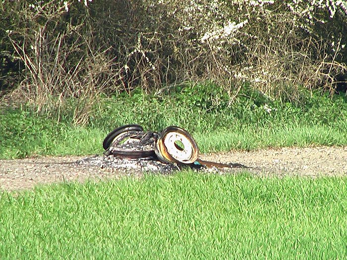 Upps, hier wurde die Reifen nicht mal von der Felge gemacht. Sondern auch einfach mal angefackelt. Und es war wieder der Hauptwanderweg gewesen. Zufall oder Absicht, das ist hier die Frage. Aber von allein kommen die Reifen nicht dorthin und durchlaufen noch einer Selbstentzündung. Bei so vielen Wundern müsste jemand ganz anderes hier herkommen.