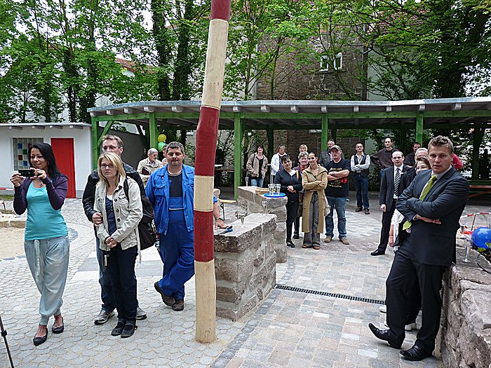 In die Einweihung eingebunden wurde auch noch eine andere Maßnahme. Im Hintergrund zu sehen das Dach des Grünen Gruppenraums. Für rund 16.000 Euro wurde mit Mitteln des Konjunkturpakets II dieses Kleinod für die Kinder geschaffen, dass sie auf der einen Seite im Freien sitzen, auf der anderen Seite aber trotzdem mit Dach geschützt sind.