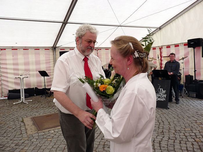 Einen Blumenstrauß gab es DRK Geschäftsführer der Krankenhausgesellschaft Brandenburg Reinhardt Posininsky für die Leiterin der Fachabteilung Geriatrie Dr. Liliane Grützner am DRK Krankenhaus Sondershausen. Sie und ihre Mitarbeiter hatten heute die neuen Räumlichkeiten, im DRK-Krankenhaus übernehmen können.