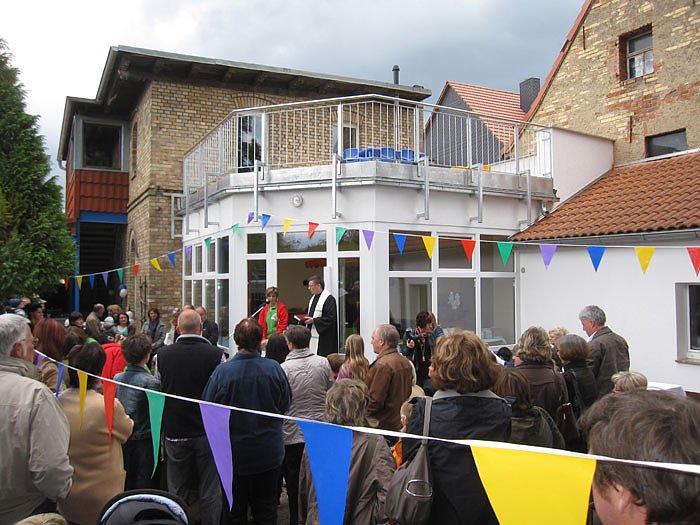 Die feierliche Übergabe im Innenhof der Einrichtung fand unter großer Teilnahme von Offiziellen, Eltern und Gästen statt. Auch Landtagsabgeordnete Gudrun Holbe unterstrich ihre Verbundenheit mit dem evangelischen Kindergarten und gratulierte zum Neubau. Diakonie-Geschäftsführer Norbert Otte, Pfarrer Traugott Lucke und Leiterin Elke Barthel freuten sich gleichfalls über die neuerliche Erweiterung und dankten allen Beteiligten, die sich zum Wohl der Kinder für den Neubau eingesetzt haben.