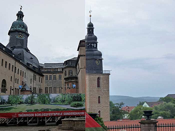 Das Schlossuhr und die Uhr der Trinitatiskirche eine unterschiedliche Zeit anzeigen ist ganz einfach der Tatsache geschuldet, dass die Schlossuhr ein Hieb beim Gewitter mit bekommen hat, das über Sondershausen gezogen war. Um 5 Minuten vor 18:00 Uhr, als kn die Sitzung des Hauptausschusses der Stadt Sondershausen verließ, zeigte sie noch brav die fast richtige Zeit an.