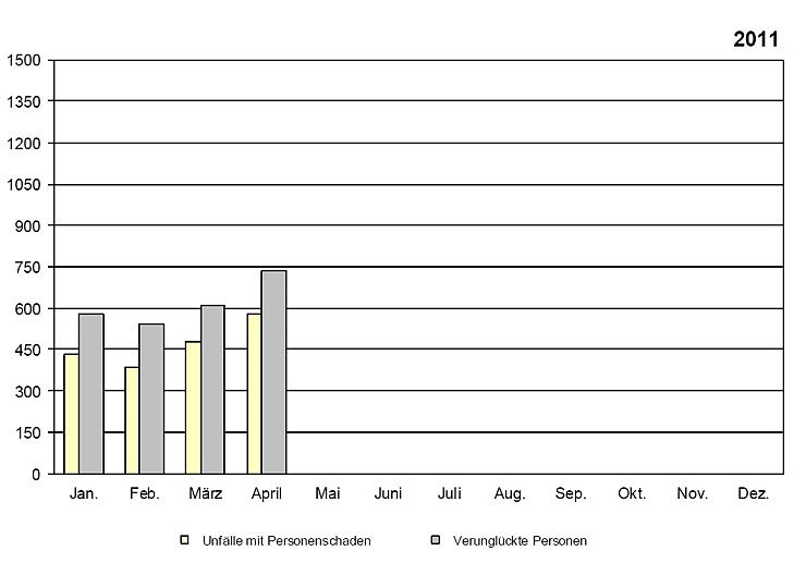Von Januar bis April 2011 ereigneten sich auf Thüringer Straßen 16 669 Straßenverkehrsunfälle. Das waren 1 387 Unfälle bzw. 7,7 Prozent weniger als in den ersten vier Monaten 2010. Die Zahl der Verunglückten erhöhte sich dagegen um 43 Personen auf 2 465 Personen.