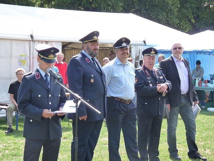 Eröffnet wurde das Feuerwehrfest vom Vorsitzende der Kreisfeuerwehrverbandes Sondershausen, Mario Hasenbein (am Mikro). Ihm zur Seite standen Dirk Hempel, sein Stellvertreter, Kreisbrandinspektor, Peter Ortlepp, der Geschäftsführer des Kreisfeuerwehrverbandes Sondershausen, Günter Herting, und der Vorsitzende der Verwaltungsgemeinschaft Greußen, Karl-Heinz Kämmerer. Letzterer bedankte sich für die durch die Kameraden der Freiwilligen Feuerwehr geleistete Arbeit.