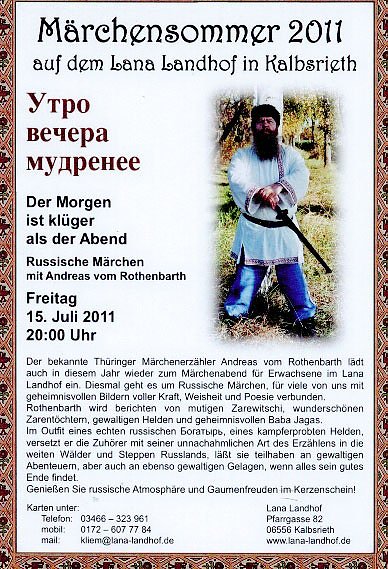 Rothenbarth wird von mutigen Zarewitschi, wunderschönen Zarentöchtern, gewaltigen Helden und geheimnisvollen Baba Jagas berichten.Im Outfit eines echten russischen ????????, eines kampferprobten Helden, versetzt er die Zuhörer mit seiner unnachahmlichen Art des Erzählens in die weiten Wälder und Steppen Russlands, lässt Sie teilhaben an gewaltigen Abenteuern, aber auch an ebenso gewaltigen Gelagen, wenn alles sein gutes Ende findet.