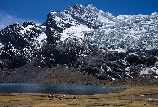 Monumentale Größe zeigt auch die Landschaft. Hohe Eisgipfel thronen über den Weideflächen der Lama- und Alpakaherden, zerrissene Gletscher speisen bunte Seen. Weiter absteigend erreicht man mit wenigen Schritten undurchdringlichen Urwald.