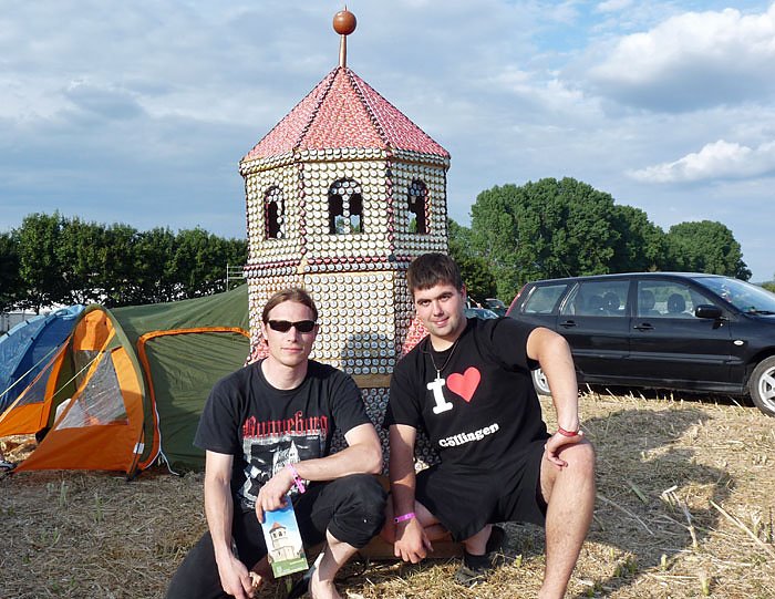 Beieindruckend die Kirmesburschen aus Göllingen. Diese Beiden haben den an Italien erinnernden Turm von Göllingen im Maßstab 1:13 in mühevoller Arbeit hergerichtet. Gut 8.000 (8!) Kronkorken wurden gebraucht, um in rund sechs Monaten den Turm zu errichten. Die Nachbildung wurde im Jahre 2006 fertiggestellt.