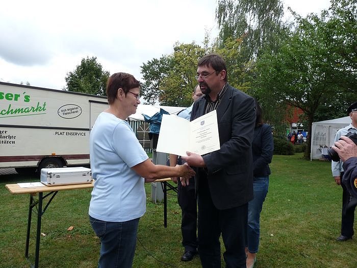 Für 40 Jahre Treue Dienste in der Freiwilligen Feuerwehr wurde Roswitha Sickel mit dem Goldenen Brandschutzehrenzeichen am Bande ausgezeichnet. Über reicht wurde die Auszeichnung von Bürgenmeister Joachim Kreyer im Auftrag der Thüringer Ministerpräsidentin Christine Lieberknecht (CDU).