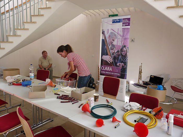Dabei gab es viel zu entdecken. Allein die Bastelwerkstatt zum Bau eigener Musikinstrumente war schon der Hit. Wir wollen den Besuchern zeigen, dass es ganz einfach ist, Musik zu machen. Dafür muss man kein Instrument beherrschen und auch nicht Noten lesen können. Wichtig ist es vielmehr, sich auf die Situation einzulassen und fantasievoll zu sein, erklärte Musikpädagogin Kerstin Dräger schon im Vorfeld der Veranstaltung das Ziel der Workshops von CLARA. Clara ist das Schul-Musik-Netzwerk des MDR (Zum Schulmusik Netzwerk )
