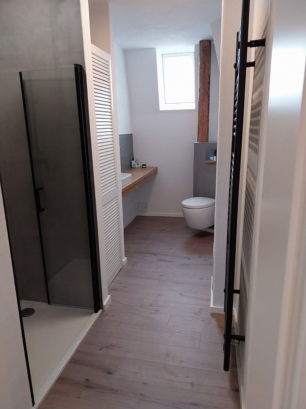 Die Wohnung ist aufgestellt mit einer Küche, sowie Wohnzimmer, Schlafzimmer, Kinderzimmer oder Büro und ein Bad mit Dusche.