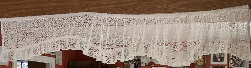 Kurzgardine - gebogt gebraucht 170 cm breit Höhe längste Stelle 34 cm, kürzeste Stelle 23 cm