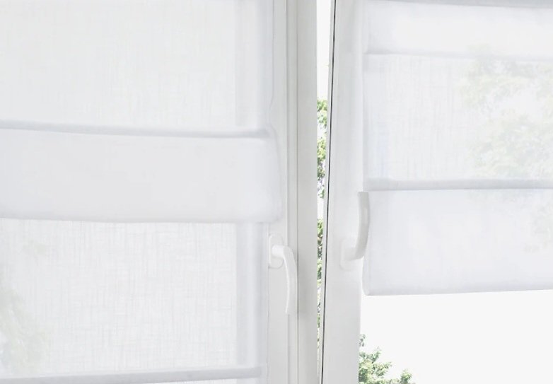 Die Gardinen werden an Scheibengardinenstangen befestigt.