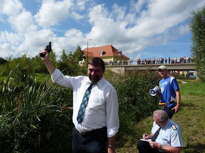 Wenn es um seine Kameraden der Freiwilligen Feuerwehren Sondershausen greift Bürgermeister Kreyer notfalls auch zur Waffe, wie hier im Bild deutlich zu sehen. Allerdings gab es keinen der erschossen werden musste, aber der Startschuss musste ja flussabwärts bei den Zeitnehmern gehört werden. Elektronisch mit Lichtschranke will man noch nicht. Man ist eben traditionell.