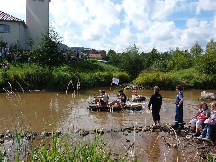 Mit dieser Leichtbauweise und viel Luft in den Gummireifen hatten die beiden Vertreter von Juventas schon fast allein gewonnen. Denn ein großes Problem auf der Wipper gab es gestern. Im Zuge des Klimawandels war der Wasserstand der Wipper so extrem niedrig, dass nur Boote in absoluter Leichtbauweise mit wenig Besatzung eine Chance hatten. Oft sah man gestern, dass die Besatzungen ihre Boote mehr geschoben haben, denn die Boote wirklich schwammen. Der niedrige Wasserstand der Wipper straft all denen Lügen, die von einem viel zu nassen Sommer sprachen. Oder ist Sondershausen ein besonderes Territorium?