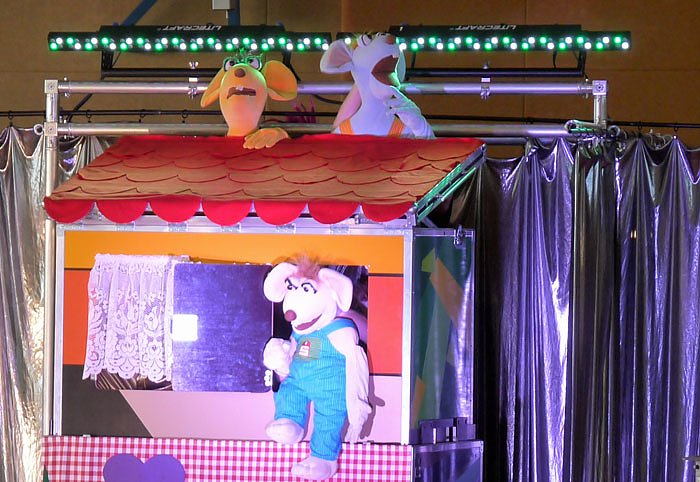 In einer spielerischen Weise sollen die Kinder etwas über Geld und den Umgang mit Geld vermittelt bekommen. So stellte Eurosita die Sparmaus (im Häuschen) dem Clown Hajo die Geldscheine vor, unterstützt von Lucie Luft..