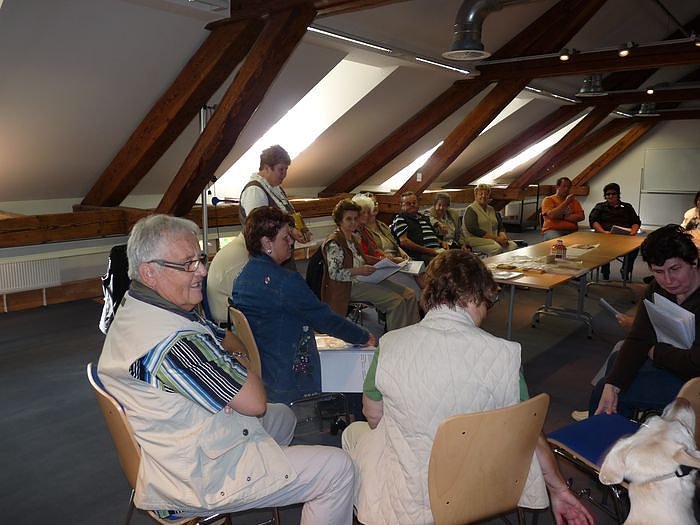Nachdem man erst eine Führung im Umfeld von Schloss Sondershausen durchgeführt hatte, traf man sich anschließend in der Landesmusikakademie. Hier teilte sich die Gruppe. In einem Raum informierte Stadtführein Heike Günther (Bild) an Hand von Tastmodellen den Aufbau und des Umfeld des Schlosses. Auch gab es Material in Blindenschrift.