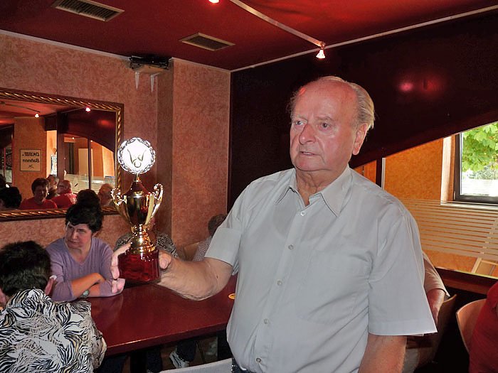 Um diesen Pokal wurde gerungen. Der Pokal ist in Sondershausen geblieben. Für die Mannschaftswertung waren die jeweils fünf besten Ergebnisse jeder Kreisorganisation (KO) herangezogen worden. Die Gewinnerin in der Einzelwertung war Waltraut Stein aus Sondershausen und der Preis war ein Gutschein für ein Essen, gespendet vom Thüringer Hof in Bad Frankenhausen. Den Platz 2 belegte ihr Mann Heinz Stein, er gewann einen großen Regenschirm. Hoffentlich kein böses Omen für das Wetter der nächsten Tage.