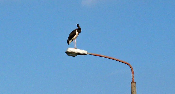 Richtig, ein scheinbar kopfloser Storch, vermutlich ein Schwarzstorch. Außerdem scheint er auch noch ein grünes Bein zu haben. Hat wohl bei der Kälte schon eine Socke übergestreift. Ist bestimmt ein Jungstorch, der etwas die Orientierung verloren hat.