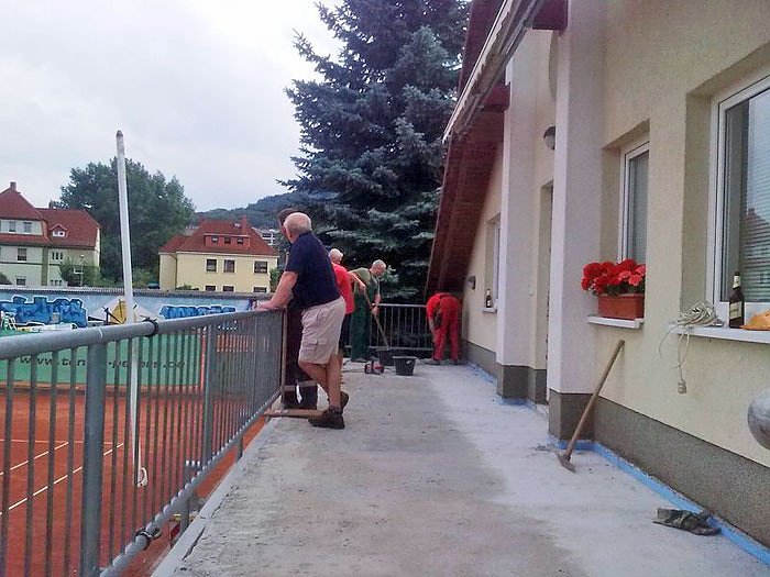 Und so wurden vom Vorstand verschiedene Projekte beschlossen und in Auftrag gegeben, wobei das Hauptaugenmerk auf die grundhafte Sanierung des Terrassenbodens vom Vereinsheim und die Neuverputzung der Garagenwand im Eingangsbereich der Anlage