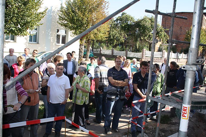 Autor: khhButtstädt. Quasi auf dem künftigen Balkon und in der guten Stube im Erdgeschoss wurde am 28. September 2011 der Grundstein für den Neubau des Wohnheimes Haus Noah in Buttstädt gelegt. Viele Gäste, unter ihnen die späteren Bewohnerinnen und Bewohner, Bürgermeister Norbert Kresse, Nachbarn, Partner sowie Mitarbeiter der Stiftung Finneck, waren vom Gehweg aus Augenzeugen der feierlichen Zeremonie, die vom Posaunenchor der Evangelischen Kirchgemeinde des Ortes eröffnet wurde.
