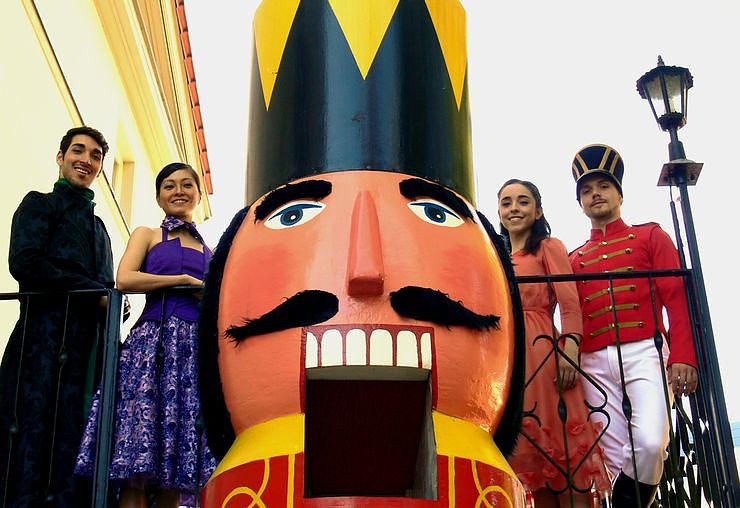In den Hauptrollen sind Thiago Fayad als Drosselmeyer, Fumiko Okusawa als Frau Stahlbaum, Irene López Ros als Marie und David Rossteutscher als Nussknacker (v. li.) zu erleben.