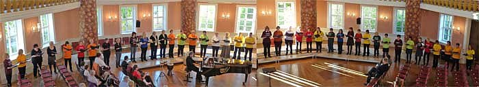 Breit aufgestellt war dieser Chor heute am Anfang. Breit aufgestellt aber auch in seiner Zusammensetzung, denn Frauen aus ganz Thüringen bildeten die Zusammensetzung dieses Chors. Frauenchor modern ist eine Weiterbildungsveranstaltung des Thüringer Sängerbundes, die sich an Sängerinnen, Chorleiterinnen und Leiter von Frauen- und Mädchenchören wendet und der Erweiterung der Repertoirekenntnis und der Erhöhung der künstlerisch-fachlichen Qualifikation dient. Unter der Leitung von Prof. Gunter Berger standen diesmal attraktive Chorsätze sowie moderne Pop- und Jazzbearbeitungen mit choreografischen Interpretationen im Mittelpunkt. Prof. Berger ist Musikfreunden sicher als Chef des MDR-Kinderchors bekannt.