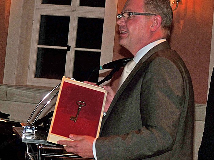Autor: khhUmrahmt von Eckhard Wehmeier, Geschäftsführer der städtischen Wohnungsgesellschaft Wippertal Sondershausen, Bürgermeister Joachim Kreyer (CDU), der Vizepräsidentin des Landesmusikrates Thüringen Daniela Heise, Thüringens Kultusminister Christoph Matschie (SPD), der 1. Beigeordneten des Bürgermeisters, Cornelia Kraffzik (SPD) und Landrat Peter Hengstermann (CDU) präsentiert der Direktor der Landesmusikakademie Thüringen, Prof. Dr. Eckart Lange, ein historischen Schlüssel, den er aus der Hand von Architekt Karsten Schmidt (AIG), dem geistigen Vater des neuen Gästehauses, empfangen hat.