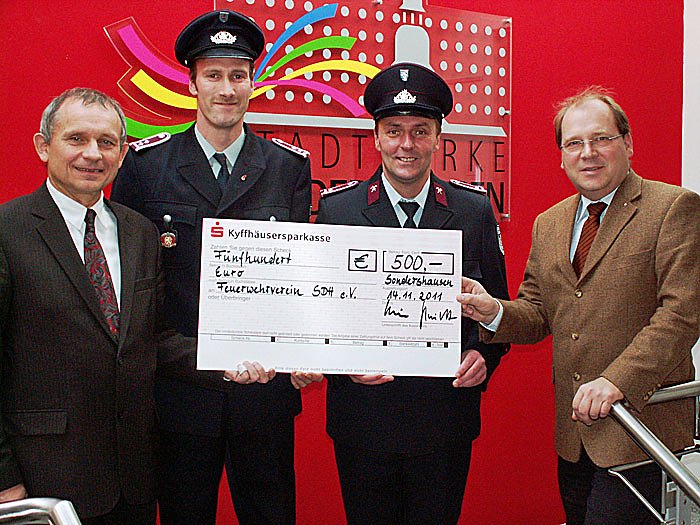 Die Übergabe der Spende erfolgte an den Vorsitzenden des Feuerwehrvereins Sondershausen-Mitte, Heiko Degenhardt und den stellvertretenden Wehrführer Andreas Hoffmann durch die Geschäftsführung der Stadtwerke Sondershausen GmbH, Wilhelm Schreier und Hans-Christoph Schmidt.