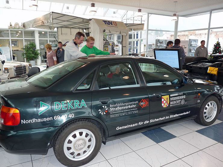 Am Spannendsten war jedoch der Brems-Simulator. Hier konnte man testen, ob man wirklich noch schnell genug für ein Auto reagierte. Gemessen wurde die Reaktionszeit, ehe man nach einem unbekannten Stoppzeichen überhaupt reagierte und der Umsetzzeit, bis die Bremse wirklich ansprach. Wer länger als 0,5 Sekunden brauchte konnte am Bildschirm nach verfolgen wie es zu einem Crash kam. Bei dieser Probe lag kn mit einer Reaktionszeit von unter 0,4 Sekunden im guten Mittelfeld, während Spitzenkräfte es unter 0,3 Sekunden brachten, was aber die deutliche Ausnahme blieb.