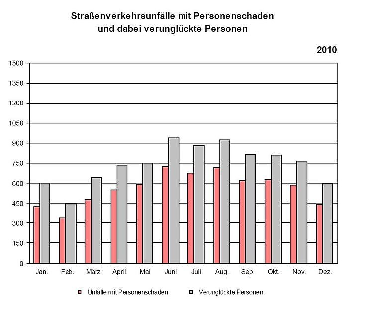 Dagegen ist die Zahl der Unfälle mit Personenschaden deutlich um 2,4 Prozent auf 5 235 Unfälle ge-stiegen. Bei diesen Unfällen kamen 116 Verkehrsteilnehmer ums Leben, 32 Menschen mehr als von Januar bis September 2010. Unter den Getöteten waren in den drei Quartalen 29 motorisierte Zwei-radfahrer, 57 Pkw-Fahrer bzw. Mitfahrer, 6 Lkw-Fahrer, 1 Fahrer eines sonstigen Kraftfahrzeuges, 9 Fahrradfahrer sowie 14 Fußgänger.