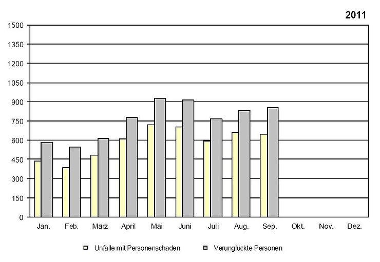Bei den 644 Verkehrsunfällen mit Personenschaden wurden 12 Personen getötet. Das waren 4 Personen mehr als im September 2010. Unter den Getöteten waren 6 Motorradfahrer, 2 Pkw-Fahrer, 1 Fahrer eines sonstigen Kraftfahrzeuges sowie 3 Fahrradfahrer. Weitere 840 Personen wurden bei Straßenverkehrsunfällen schwer oder leicht verletzt. Die Zahl der Verletzten erhöhte sich um 31 Personen.