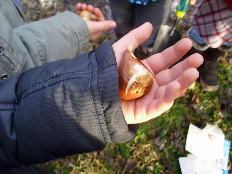 Bereits bei der Begrüßung merkten wir, dass die Kinder schon ganz aufgeregt und angespannt waren. Gleich geht's los. Unsere beiden Betreuerinnen vom Verein, Frau Marx und Frau Köhler verteilten kleine Schäufelchen an die Kinder und die Betreuerinnen von der Kita Arche Noah, Frau Müller und Frau Schunke, verteilten an die Kinder die mitgebrachten Blumenzwiebeln. Nun war keines der Kinder mehr zu halten, jetzt musste es unbedingt los gehen. Nach einer ganz kurzen Einweisung buddelten alle mit großer Begeisterung in der vorgesehenen Blumenrabatte am Zaun ein kleines Loch, steckten die Blumenzwiebel hinein und verschlossen das Loch wieder mit Erde. Ganz genau achteten alle darauf, dass die Zwiebel ja auch richtig herum ins Loch kam und nicht etwa die Wurzelseite nach oben zeigt.