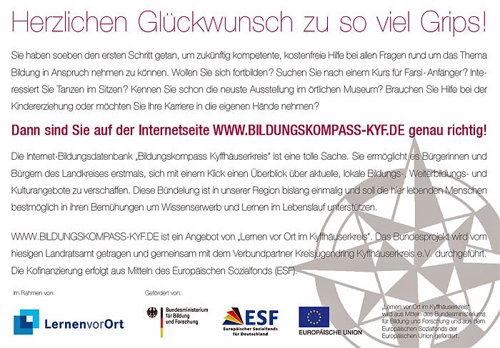 Der sogenannte Bildungskompass ist ein kostenloses Angebot des vom Landratsamt getragenen und in Zusammenarbeit mit dem Verein Kreisjugendring Kyffhäuserkreis durchgeführten Bundesprojekts Lernen vor Ort. Unter der Internetadresse www.bildungskompass-kyf.de können sich Interessierte über zahlreiche Bildungsangebote und -anbieter in der Region informieren. Zudem finden sich Verweise zu weiterführenden Bildungsdatenbanken von IHK und Agentur für Arbeit. Bereits 65 Bildungsanbieter beteiligen sich am Bildungskompass. Derzeit sind rund 300 Kurs- und Weiterbildungsangebote eingestellt, davon ein Großteil von den Schwergewichten der Erwachsenenbildung im Kreis – der Volkshochschule und der Ländlichen Heimvolkshochschule im Kloster Donndorf. Hier finden sich vom simplen Bastelkurs, über Englisch-Lehrgänge bis hin zu Vorträgen über fernöstliche Entspannungstechniken eine bunte Vielfalt an verschiedensten Bildungs- und Kulturangeboten.