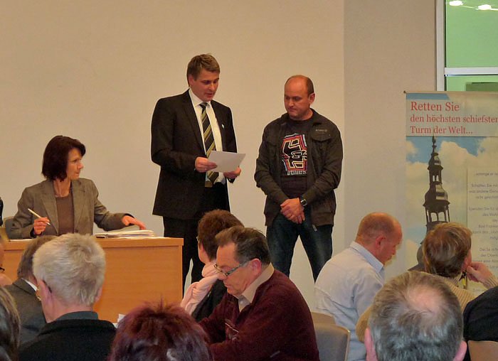 Auf Antrag des Bürgermeisters konnte Prüfstatiker Dr. Trabert nochmals darlegen, dass der schiefe Turm nicht sobald umstürzen wird. Auch er ist sich sicher, dass der Turm erhalten werden kann.